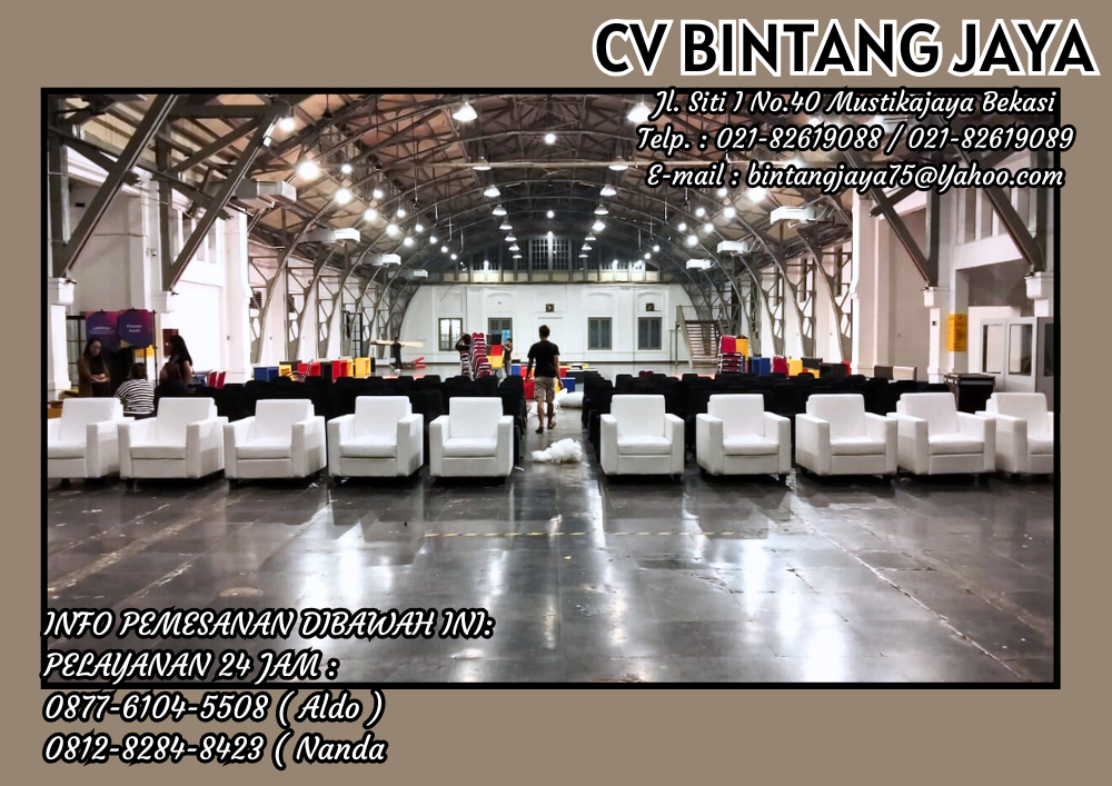 Pusat sewa sofa jakarta termurah dan berkualitas untuk berbagai macam acara pesta event. Kualitas sofa dengan busa yang empuk mampu membuat nyaman pengguna’nya, bersih dan selalu terlihat baru karna kami selalu mensterilisasikan sebelum dan sesudah pemakian. Sofa dengan ukuran tinggi 90cm dan ukuran lebar 55cm ini siap dengan harga sewa yang terjangkau, membuat anda tak perlu bingung untuk menjadikan kami CV BINTANG JAYA sebagai rekan anda dalam mensupport acara event, membuat sukses besar untuk acara anda tentunya. Selain itu kami juga mengutakan kuantintas produk kami demi kenyamana’an pelanggan.